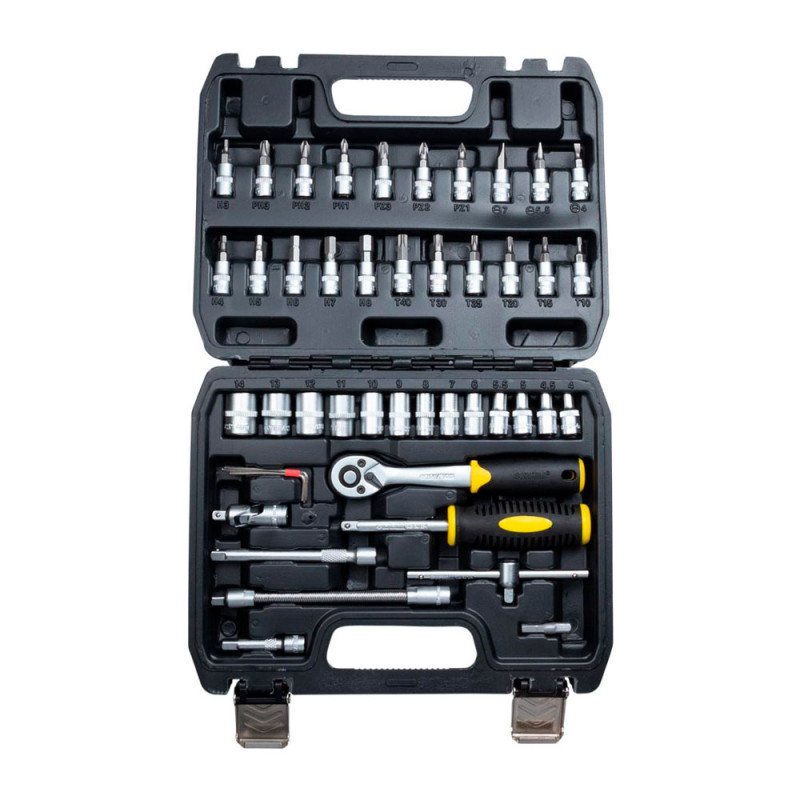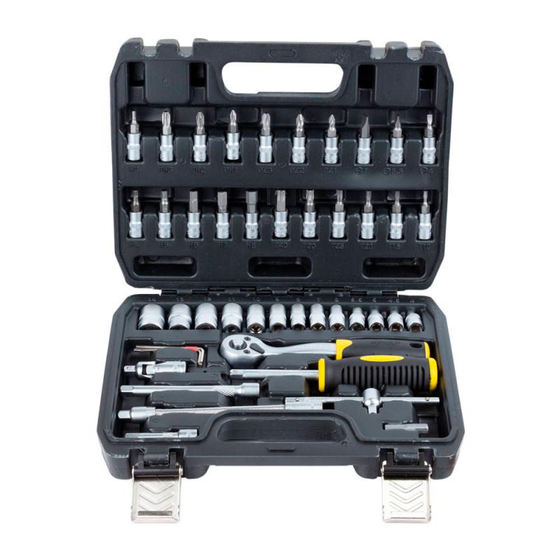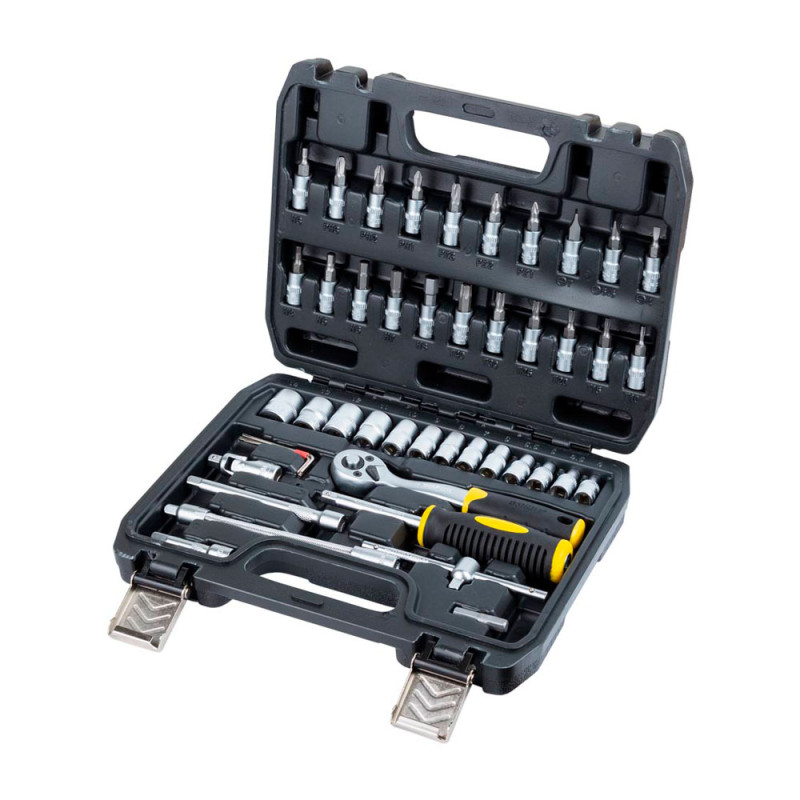 Комплект включає торцеві насадки, шарнір карданний, подовжувачі, воротки та тримач для біт. Рукоятка з храповим механізмом на 72 зуби забезпечує комфортну та точну роботу з кріпильними елементами. Для професійних і домашніх майстрів це універсальне рішення, яке підходить як для складання меблів, так і для обслуговування автомобілів. Дивіться також інструменти та обладнання.