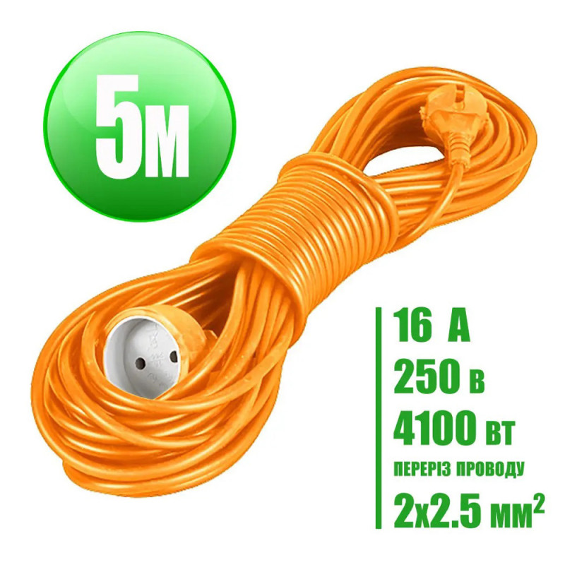 Кабель має міцну ізоляцію з ПВХ з додатковим захистом від ультрафіолетового випромінювання, що підвищує його стійкість до зовнішніх факторів під час експлуатації. Контактна група виготовлена з латуні, що забезпечує надійний електричний контакт і довговічність підключення. Подовжувач працює в електромережах з напругою 220–250 В і частотою струму 50/60 Гц та сумісний із розетками стандарту EURO/UKR.