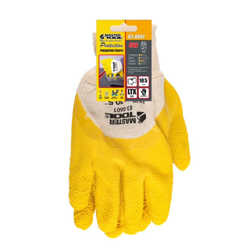 Робочі рукавички скляра Mastertool з облитою долонею жовті (код товару: 6100) призначені для робіт, де необхідний контроль і безпека при роботі з крихкими та гладкими матеріалами. Основа з бавовни забезпечує комфорт і вентиляцію, а облив 3/4 ефективно захищає робочу частину руки. Рукавички відповідають стандарту EN388 (2-стирання, 1-порізи, 3-розриви, 1-проколи) та підходять для регулярного використання.