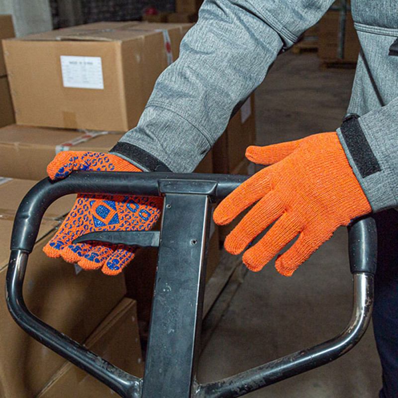 Рабочие перчатки DOLONI 526 ДКГ с точечным ПВХ покрытием orange (код товара: 124) предназначены для выполнения общепроизводственных, складских и монтажных работ. Изготовленные из комбинированной ткани (ХБ 70%, ПЭ 30%), они обеспечивают комфорт при использовании и высокую износостойкость. Благодаря применению 4 нитей и 10 классу вязки перчатки обладают оптимальной плотностью, обеспечивая надежную защиту рук при ежедневной эксплуатации.