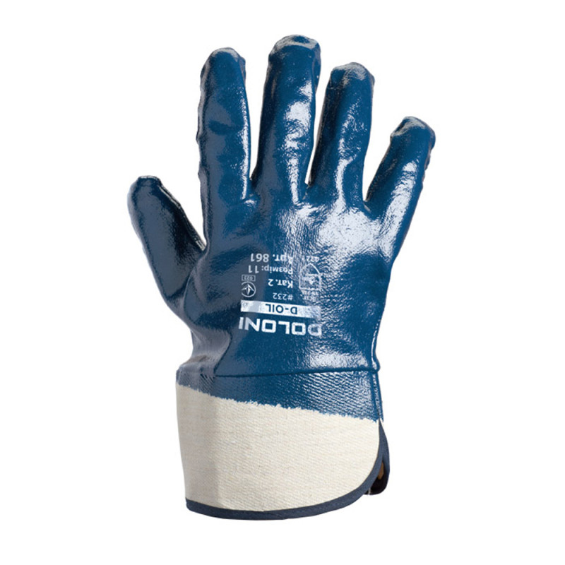 Рабочие перчатки DOLONI 861 ДКГ с полным нитриловым покрытием (код товара: 4747) предназначены для работы с нефтепродуктами, маслами и агрессивными жидкостями. Основа из хлопка обеспечивает комфорт, а размер 11 (2XL) подходит для большой руки и интенсивной эксплуатации.