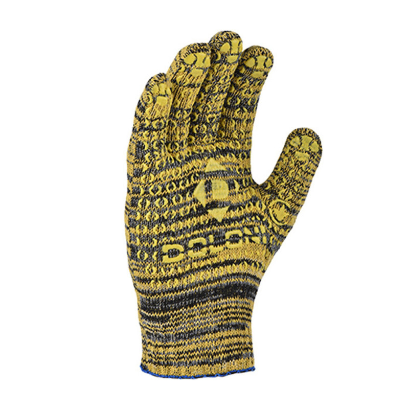 Робочі рукавички DOLONI 4242 трикотажні жовті з ПВХ малюнком Рябушка (код товару: 122) призначені для захисту рук під час виконання загальновиробничих, монтажних та господарських робіт. Виготовлені з бавовняної тканини зі складом ХБ 70% та ПЕ 30%, вони поєднують комфорт, міцність та зносостійкість. Завдяки 4 ниткам і 10 класу в’язання рукавички мають підвищену щільність, що забезпечує надійний захист і довгий термін служби.