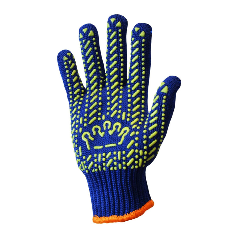 Рукавички Корона сині з малюнком ПВХ (код товару: 4811) призначені для роботи в умовах підвищеного зносу та навантаження. Завдяки 7 класу в’язання та використанню 6 ниток рукавички мають щільну та міцну структуру. Основа з бавовняної тканини (ХБ 60%, ПЕ 40%) і вага 90 г забезпечують комфорт і довгий термін служби.