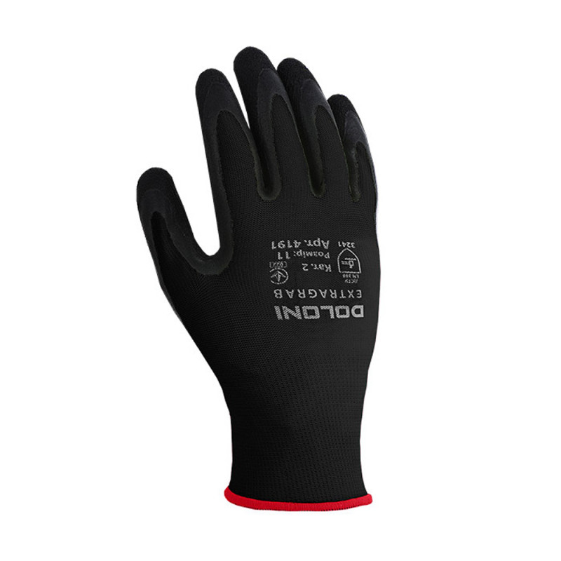 Рукавички DOLONI 4191 поліестерові з латексним покриттям, неповна облива чорні (код товару: 4407) призначені для робіт, де важливі точність і зручність при збільшеному розмірі руки. Основа з поліестеру забезпечує еластичність і зносостійкість, а неповне латексне покриття захищає робочу частину руки. Рукавички відповідають стандарту EN388 (3-стирання, 2-порізи, 4-розриви, 1-проколи) і підходять для щоденного використання.