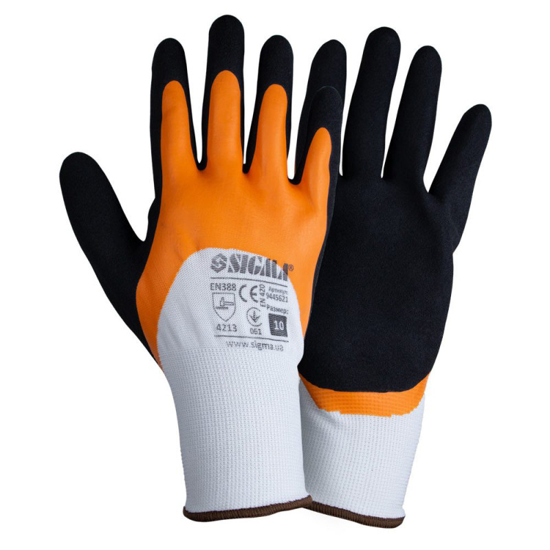 Рукавички Sigma трикотажні з подвійним латексним покриттям 9445621 (код товару: 6477) призначені для робіт з підвищеним навантаженням і контактом з агресивними середовищами. Основа з поліестеру забезпечує еластичність і міцність, а подвійний латексний облив 3/4 захищає робочу частину руки. Рукавички відповідають стандарту EN388 (4-стирання, 2-порізи, 1-розриви, 3-проколи) і розраховані на інтенсивне використання.